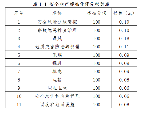 第十八條 煤礦安全生產(chǎn)標(biāo)準(zhǔn)化考核滿分為100分,采用各部分得分乘以權(quán)重的方式計算,各部分的權(quán)重見表1-1。